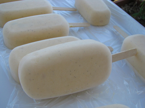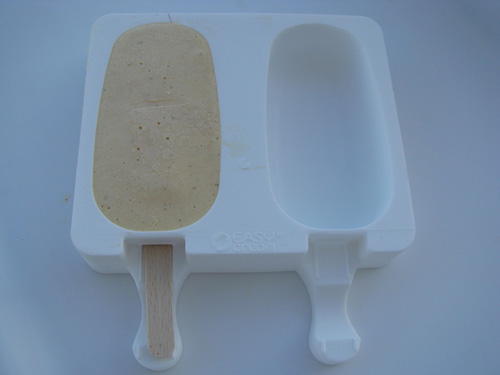 Frullate per due o tre minuti, fino ad ottenere una purea omogenea (4). Fate raffreddare completamente. Quando sarà completamente freddo unitelo al composto di acqua e zucchero,(5) Mescolate accuratamente e versate il composto nella vaschetta (6).